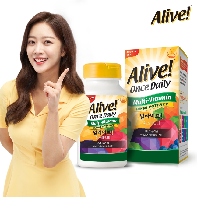 주력제품인 ‘얼라이브 원스데일리’는 에너지 생성과 활력에 도움을 주는 고함량 비타민B군 8종을 비롯해 21가지 비타민과 미네랄, 54가지 부원료를 하루 한 알로 간편하게 섭취할 수 있는 제품이라고 한다.