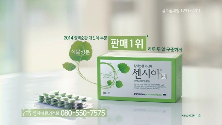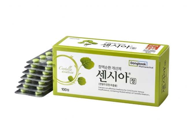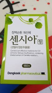 센시아는 센텔라정량추출물이 주성분으로 정맥의 탄력 향상과 모세혈관 투과성 정상화, 항산화 효과가 있어 다리가 붓거나 무겁고 저리거나 아픈 증상을 완화해 준다. 생약성분의 일반의약품으로 병원 처방전 없이 약국에서 구입할 수 있다.