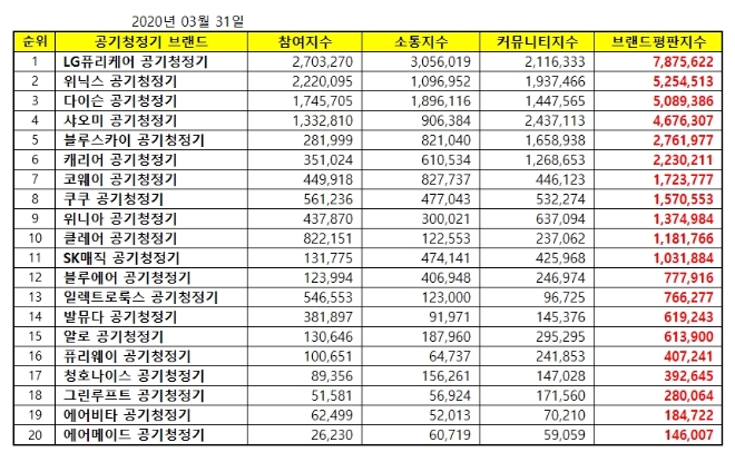 2020년 3월 공기청정기 브랜드평판 순위는 LG퓨리케어, 위닉스, 다이슨, 샤오미, 블루스카이, 캐리어, 코웨이, 쿠쿠, 위니아, 클레어, SK매직, 블루에어, 일렉트로룩스, 발뮤다, 알로, 퓨리웨이, 청호나이스, 그린루프트, 에어비타, 에어메이드 순으로 분석됐다고 한다.