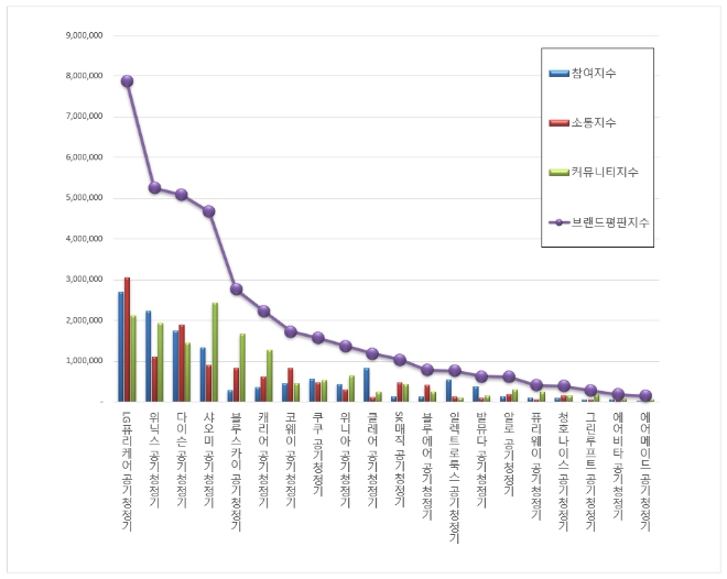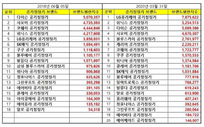 한국기업평판연구소는 국내 소비자에게 사랑받는 공기청정기 브랜드 20개에 대한 브랜드 빅데이터 평판분석을 했다고 한다. 2020년 2월 29일부터 2020년 3월 30일까지의 공기청정기 브랜드 빅데이터 38,958,994개를 분석했다고 한다. 지난 2018년 6월 공기청정기 브랜드 빅데이터 31,294,798개와 비교하면 24.49% 증가했다고 한다.