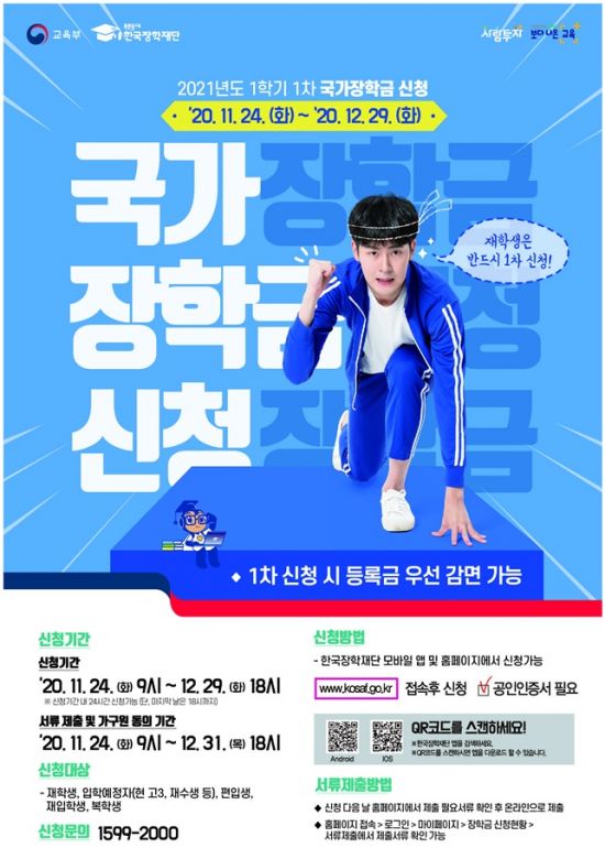 교육부와 한국장학재단은 11월 24일 오전 9시부터 12월29일 오후 6시까지 2021학년도 1학기 1차 국가장학금 신청을 받는다고 밝혔다고 한다.