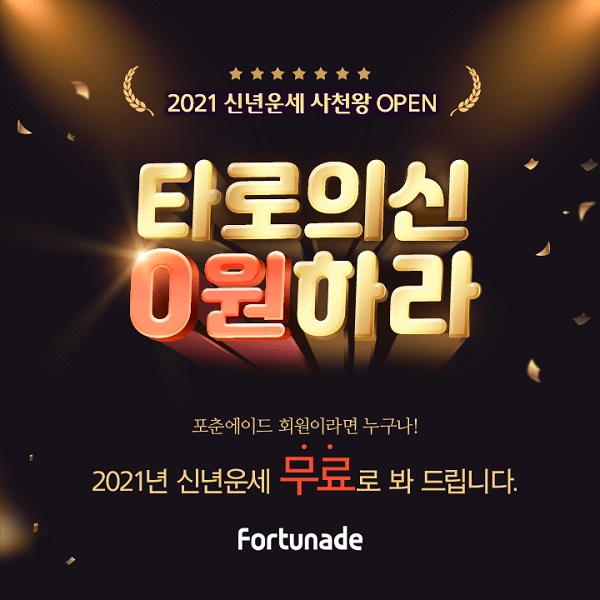 ‘2021 타로의 신 0원하라!’ 무료 신년운세 이벤트는 11월 30일까지 포춘에이드 공식 홈페이지 및 모바일 웹에서 진행하였으며, 포춘에이드 회원 누구나 무료 이용이 가능했었다고 한다.