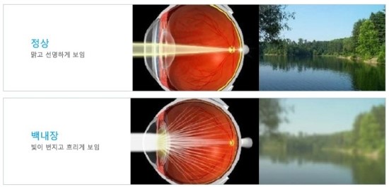 백내장이란 우리 눈에는 사진기의 렌즈에 해당하는 투명한 수정체가 있는데 이것이 불투명하게 혼작이 와 있는 상태를 백내장이라 한다.