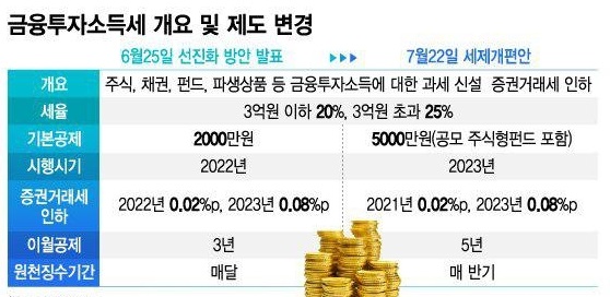 2023년부터 금융투자상품의 투자손익에 대한 양도세를 내는 가운데 국내상장주식과 공모주식형 펀드수익을 합산해 매년 최대 5000만원이 기본공제 된다고 한다. 지난 기재부는 '금융세제 선진화 추진방향'을 통해 국내주식에 대해서만 2000만원 기본공제 방침을 밝혔지만 한 달만에 공제대상이 대폭 확대된 것이라고 한다.