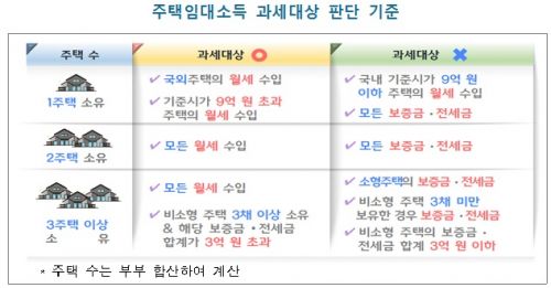 올해 신고 대상은 월세 임대수입이 있는 2주택 이상 소유자와 보증금 등의 합계액이 3억원을 초과하는 3주택 이상 소유자다. 주택 수는 부부는 합산해 계산하고, 기준시가 9억원 초과 주택과 국외 소재 주택의 월세 임대소득에 대해서는 1주택자도 과세한다고 한다.