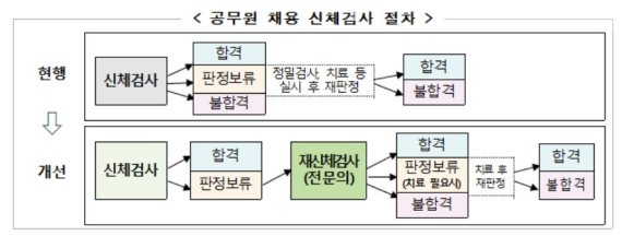 한 인사혁신처 차장은 “이번 개정은 보건·위생과 의학기술의 발전, 기본권에 대한 의식 향상 등에 맞춰 신체검사 기준과 절차를 근본적으로 개선한 것”이라며 “앞으로도 사회적 가치를 고려한 정책을 지속적으로 추진하겠다”고 밝혔었다고 한다.