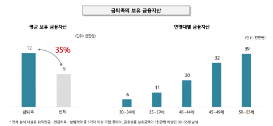 금퇴족은 전 연령대에서 펀드·연금·신탁 규모가 전체 보유 금융자산 중 60% 이상을 차지한다고 한다. 이는 전체평균보다 7~15%p 높은 것이라고 한다.