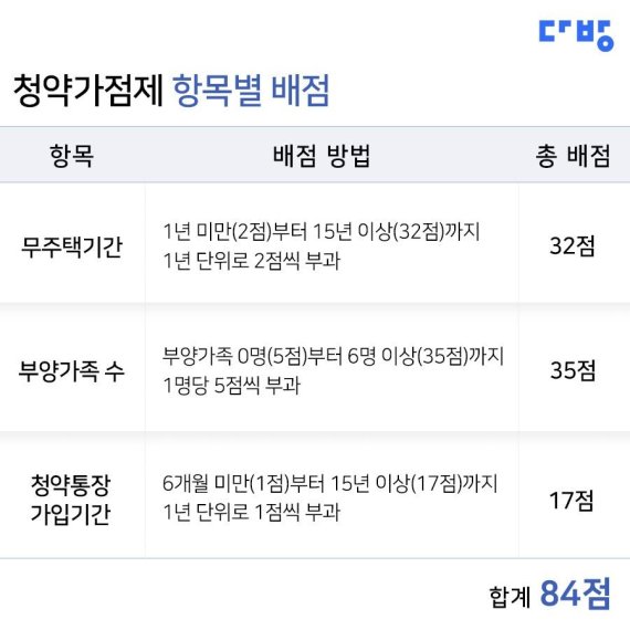 가점 항목은 무주택기간(2~32점), 부양가족 수(5~35점), 청약통장 가입기간(1~17점) 등으로 구성되며 총 84점이 만점이라고 한다. 특히 많은 사람들이 혼란스러워하는 항목이 무주택기간과 부양가족 수 가점 계산이라고 한다.