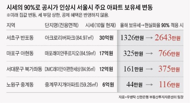 공시가격을 시세의 90%까지 올리면 집값이 한 푼도 오르지 않아도 세금 부담은 저절로 늘어난다고 한다. 한 시중은행 부동산 전문가는 서울 주요 아파트 단지의 보유세 부담을 모의 계산한 결과, 현재 시세 30억원인 서초구 반포동 ‘아크로리버파크’(전용면적 84.97㎡)를 가진 1주택자는 올해 재산세와 종부세를 총 1326만원 내지만, 시세 반영률이 90%로 오르면 2643만원을 부담해야 한다고 한다. 집값이 매년 5%씩 오른다고 가정하면 2025년엔 4096만원까지 보유세가 나올 수 있다고 한다.