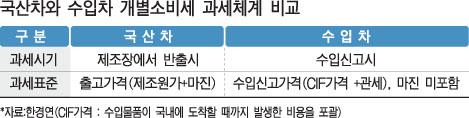 국산차와 수입차의 자동차 개별소비세 과세 시점이 달라 문제가 되고 있는 만큼 최종단계인 '판매장 과세'로 전환해야 한다는 지적이 제기됐다고 한다.